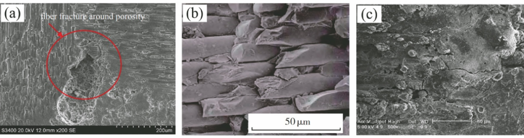 圖6 C/SiC在激光加工中產生的缺陷:(a)纖維斷裂;(b)基體缺失;(c)微裂紋