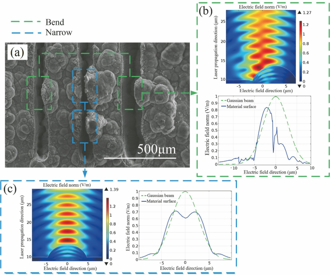 CMC-SiC主要由最外側的SiC層和內部的SiC基體、纖維及界面層組成,在纖維編織結構中還包含許多微小孔隙,復雜的材料結構致使CMC-SiC在激光加工過程中會產生與一般均質材料不同的物理和化學變化。在纖維增強復合材料與激光相互作用機理方面,國內外學者基于理論與實驗進行了大量探索。吳恩啟等理論研究了碳纖維增強復合材料的熱傳導規律,推導出了復合材料內部纖維束平面內熱擴散系數與相位梯度的關系。纖維編織復合材料具有各向異性的特點,纖維束方向會直接影響熱傳導規律,且復合材料的熱擴散系數與編織方式和基體材料分布相關。Allheily等研究了高能量激光對碳纖維增強復合材料的燒蝕機制,發現碳纖維增強復合材料對激光輻照產生的熱量具有很強的隔絕作用,主要原因在于碳纖維能夠承載并吸收熱量,層間基體材料的燒蝕可以有效降低激光能量的積累。Zhai等使用波動光學仿真軟件分析了C/SiC原始表面粗糙度對激光加工效果的影響,仿真結果表明C/SiC原始表面形貌對激光刻蝕效果有顯著影響,激光輻照在C/SiC表面凸起的不同位置時,電場會發生偏移或減弱,電場強度的不均勻分布導致C/SiC表面不同區域的刻蝕形貌存在差異,如圖2所示。