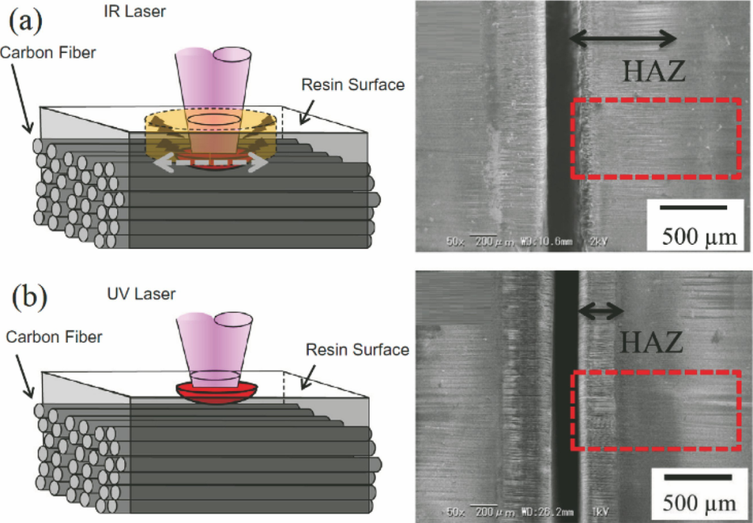 圖3 不同波長激光對纖維增強材料的作用效果對比:(a)紅外激光;(b)紫外激光