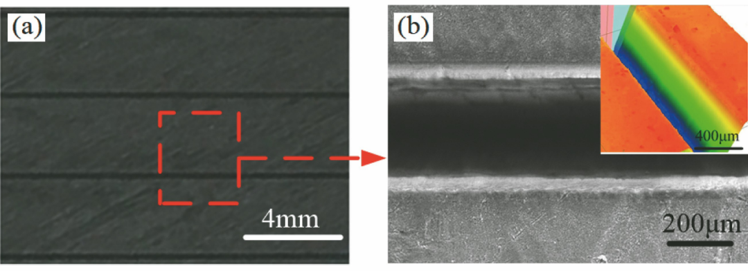 圖8 SiC/SiC的飛秒激光加工效果:(a)加工區域;(b)局部放大圖
