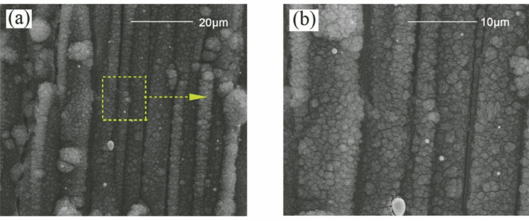 為了控制CMC-SiC中由激光熱作用導致的加工缺陷利用超短脈沖激光對CMC-SiC 進行精密加工成為國內外學者研究的熱點。蔡敏等對比了納秒激光和皮秒激光的SiC/SiC加工效果,結果表明:納秒激光加工過程中材料表面同樣存在熱影響區,導致激光輻照區域產生了重鑄層、分層及微裂紋等缺陷;利用皮秒激光加工,相對納秒激光,SiC/SiC的加工質量有顯著提高,激光輻照區域未發現熱影響區,即重鑄層、分層、微裂紋等缺陷在皮秒激光加工中得到了有效抑制。Liu等利用皮秒激光開展了C/SiC的微孔加工實驗,研究發現:當激光功率密度較低時,孔內形成的反沖氣壓同樣較低,導致孔內碎屑不能有效噴出;升高激光功率密度后,加工過程中孔內產生強烈的沖擊波,形成的反沖高壓使得碎屑從孔內高速向外噴射,微孔加工質量明顯提高。Moreno等開展了飛秒激光加工纖維增強復合材料的實驗研究,發現內部基體材料的尺寸和形狀對激光加工質量存在較大影響。在飛秒激光參數的合理調控下,纖維增強復合材料獲得了良好的加工質量。Zhai等在SiC/SiC上利用飛秒激光進行了多種微結構的制備研究,檢測報告顯示SiC/SiC加工區域輪廓清晰,沒有出現機械加工常見的崩邊、纖維拔出,以及長脈沖激光加工中明顯的熱影響區。為了驗證加工效果,利用飛秒激光在SiC/SiC表面制備了大面積的微槽結構,加工效果如圖8所示。
